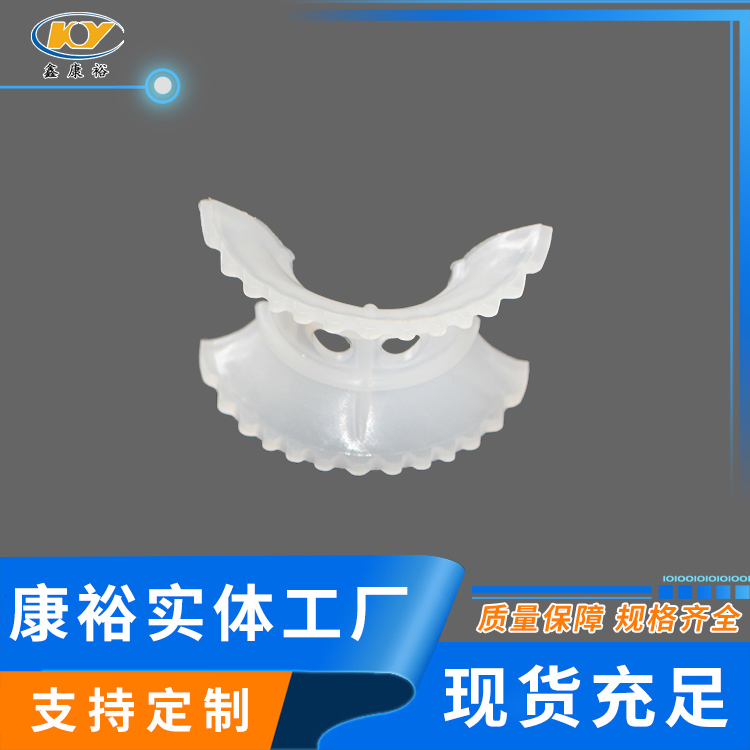 塑料異鞍環(huán)是20世紀(jì)70年代美國(guó)Noton公司對(duì)普通矩鞍環(huán)填料作出了改進(jìn),其特點(diǎn)是將扇形弧面改進(jìn)成帶鋸齒邊緣的貝殼狀弧面,并在鞍背上增加了開(kāi)孔,這樣填料層內(nèi)的通道更加通暢,改善了液體分布性能,降低了氣體通過(guò)的阻力,提高了傳質(zhì)性能。塑料異鞍環(huán)鞍形填料類似于馬鞍形狀,這種填料層中主要為弧形的液體通道,填料層內(nèi)的空隙較環(huán)形填料(尤其較拉西環(huán)填料)更加連續(xù)。